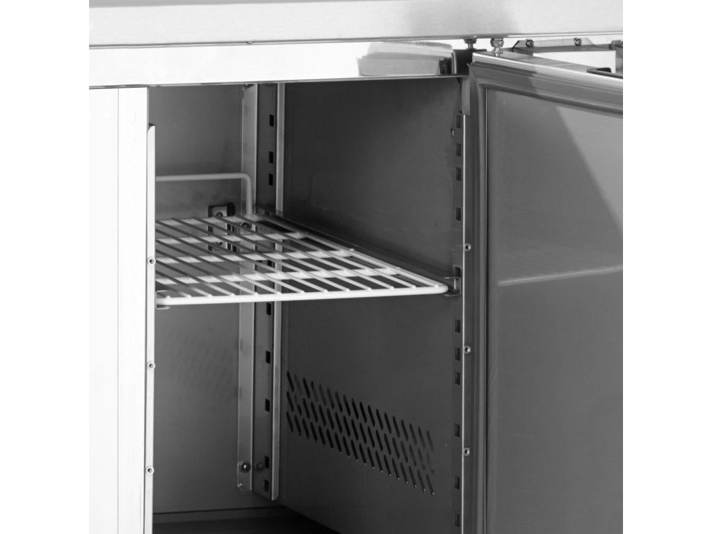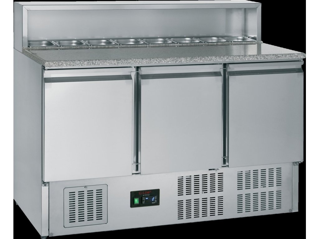 Stoly na pizzu ze série G-line jsou fantastické pro přípravu pizzy. Vše potřebné máte na dosah. Vyskládejte různé ingredience do gastronádob GN 1/6 a použijte vnitřní prostor pro skladování a snadné doplňování. Žulová deska stolu je ideální pro přípravu lahodného pizza těsta, protože zůstává chladná a těsto se tolik nelepí na desku stolu.prověřená kvalita za příznivou cenu|žulová pracovní deska|automatické odmrazování|dveře|nastavitelné nožky|nerezové provedení|chlazení s pomocným ventilátorem