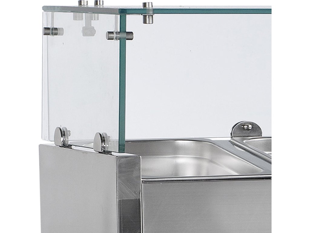 The GVC38 range of vitrine coolers is a great addition to gastro counters, as it enables you to have everything you need for food preparation within reach. It accepts GN1/3, GN1/6 and GN1/2 pans (not included). The cooler is made in SS201 stainless steel with a glass sneezeguard to protect the food. Ideal for pizza places, fast food restaurants, and sandwich shops.nerezová ocel|skleněné krytí na ochranu potravin|přizpůsobeno GN1/3 (nejsou součástí balení)|digitální termostat a teplotní displej|statické chlazení|nastavitelné nožky