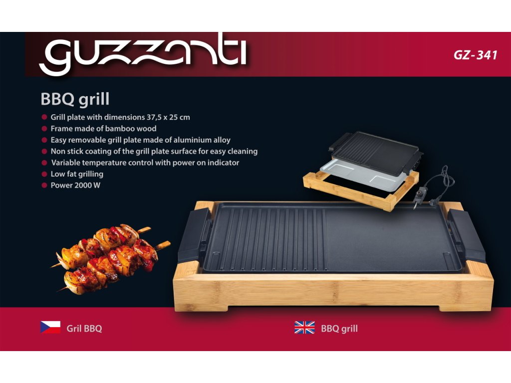Gril BBQ Guzzanti GZ 341grilovací deska o rozměru 37,5 x 25 cm je uložena v rámu z bambusového dřeva