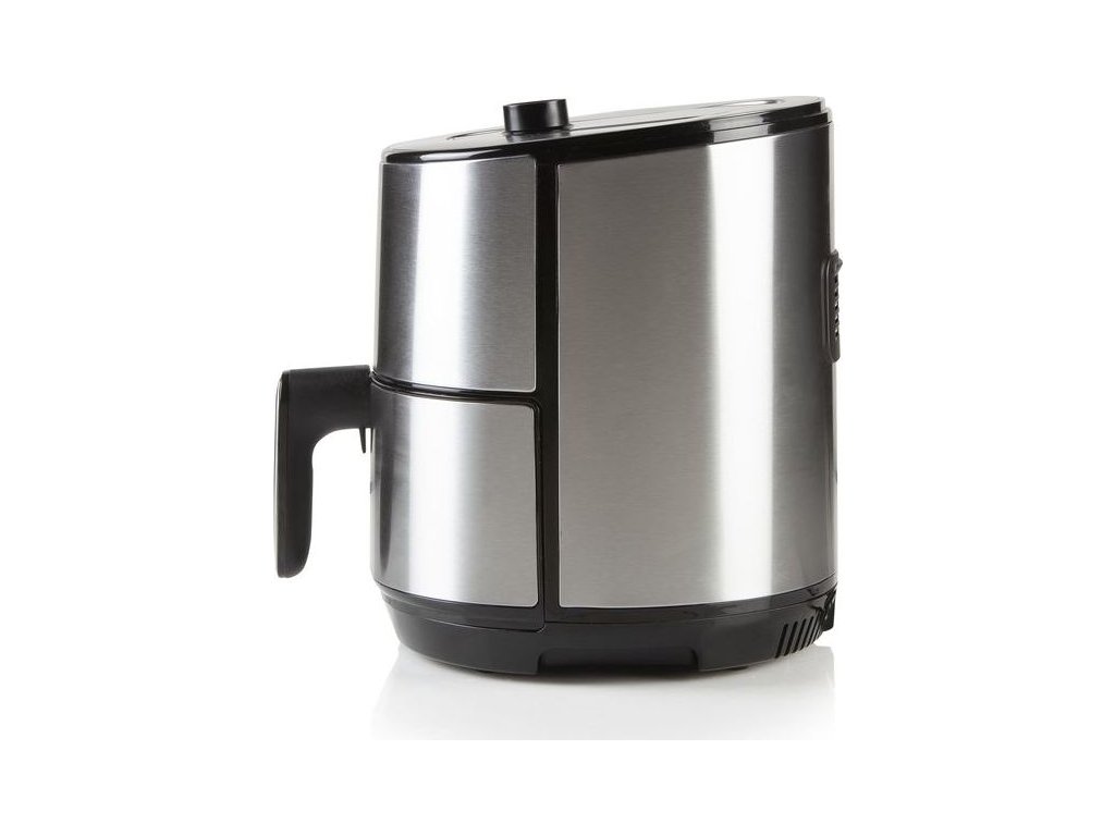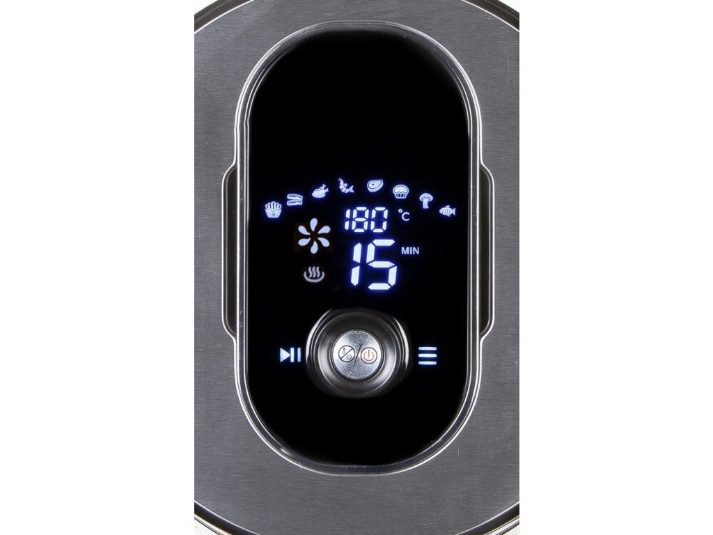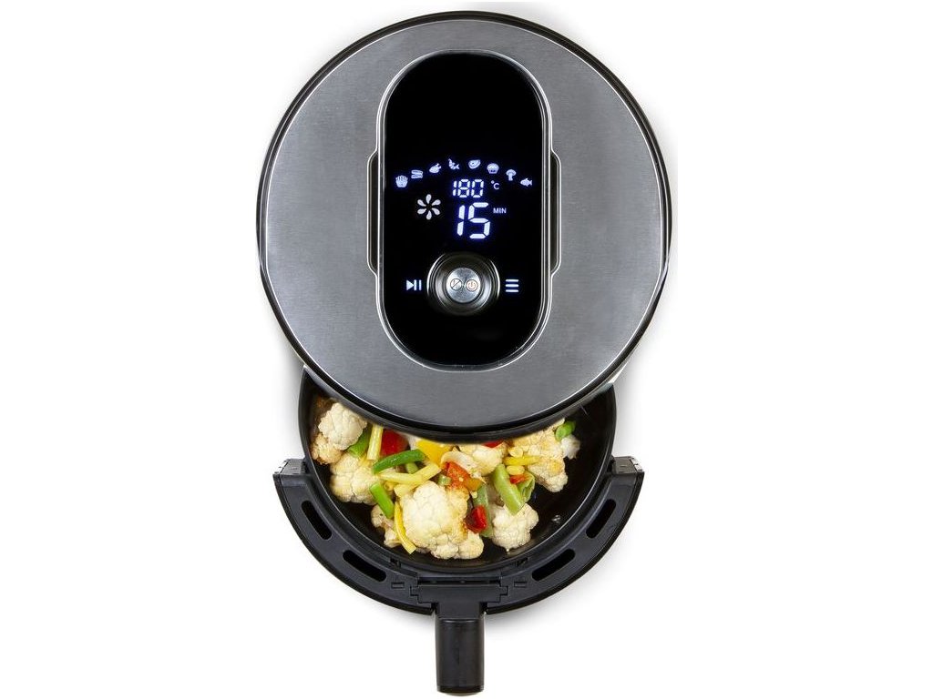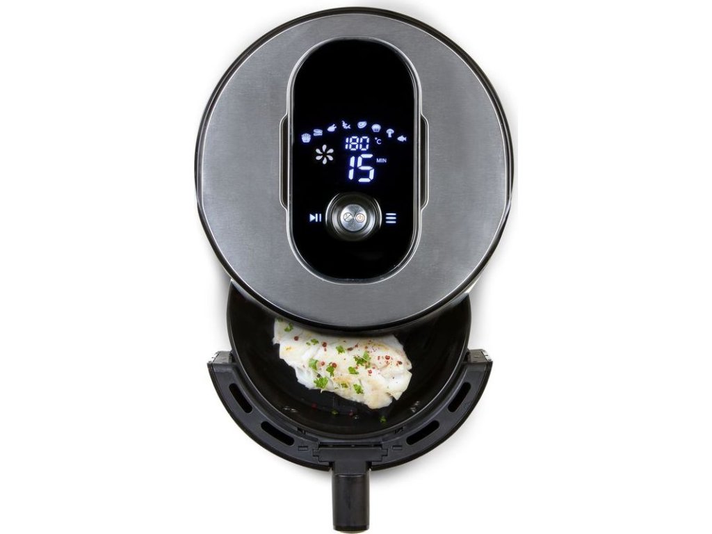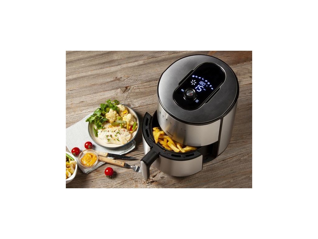 Digitální horkovzdušná fritéza v nerezovém provedení o objemu fritovacího koše 4 l, který pojme až 1,2 kg surovin. Fritování bez oleje horkým vzduchem, grilování, ohřívání hotových pokrmů i rozmrazování. Na přehledném velkém LCD displeji si snadno nastavíte čas a teplotu, nebo si zvolíte jeden z 8 přednastavených programů. Celou dobu máte nad průběhem nastaveného programu plnou kontrolu a můžete kdykoliv probíhající program pozastavit, nebo upravit teplotu i čas.