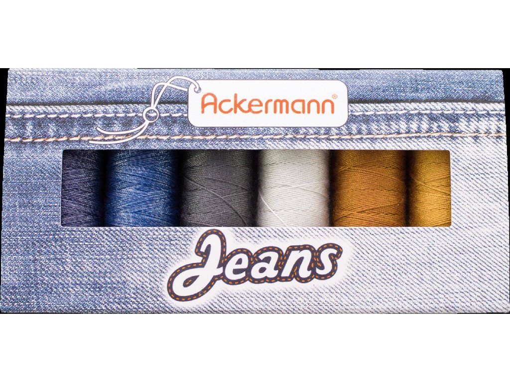 6 x 150 m džínová nit Ackermann je vysoce kvalitní nit vhodná pro šití silných a hustých látek, jako jsou džíny. V této sadě je šest barev ve velikosti 80