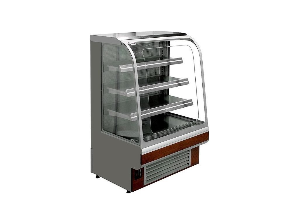 ventilované chlazení|vestavěný agregát|digitální termostat|automatické odtávání + odpařování kondenzátu|3 chlazené nastavitelné skleněné police|chlazená nerezová výstavní plocha|LED osvětlení polic a vitríny - barva bílá teplá|čelní a boční oblá izolační skla|pevná záda