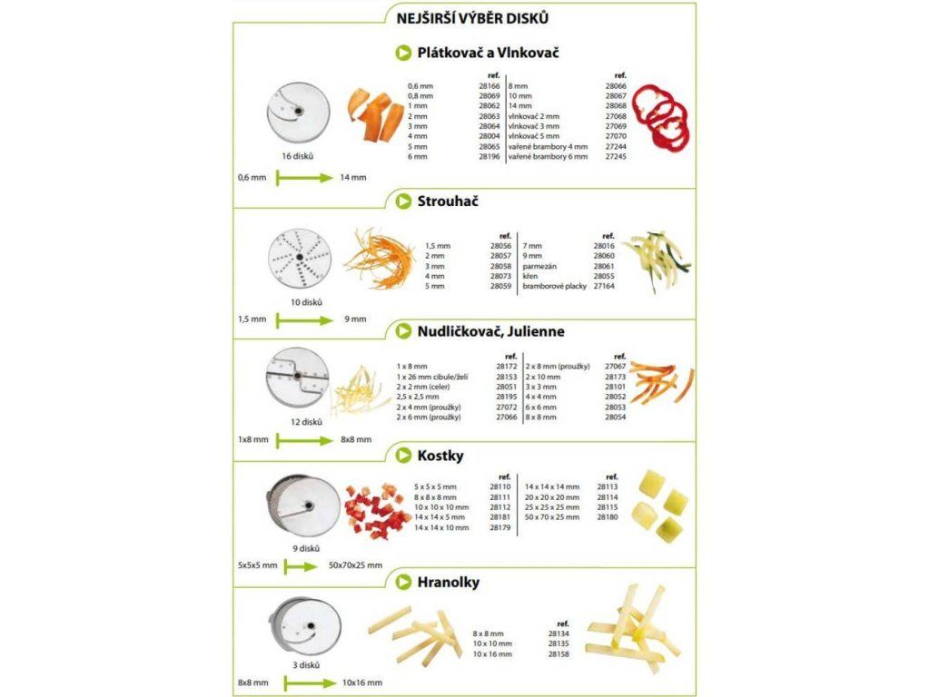 - 1985 W sada 6 disků – plátkovač 2 a 4 mm, strouhač 1,5 mm, nudličkovač 4×4 mm, kostičkovač 14×14×14 mm (2 disky – plátkovač + mřížka)
