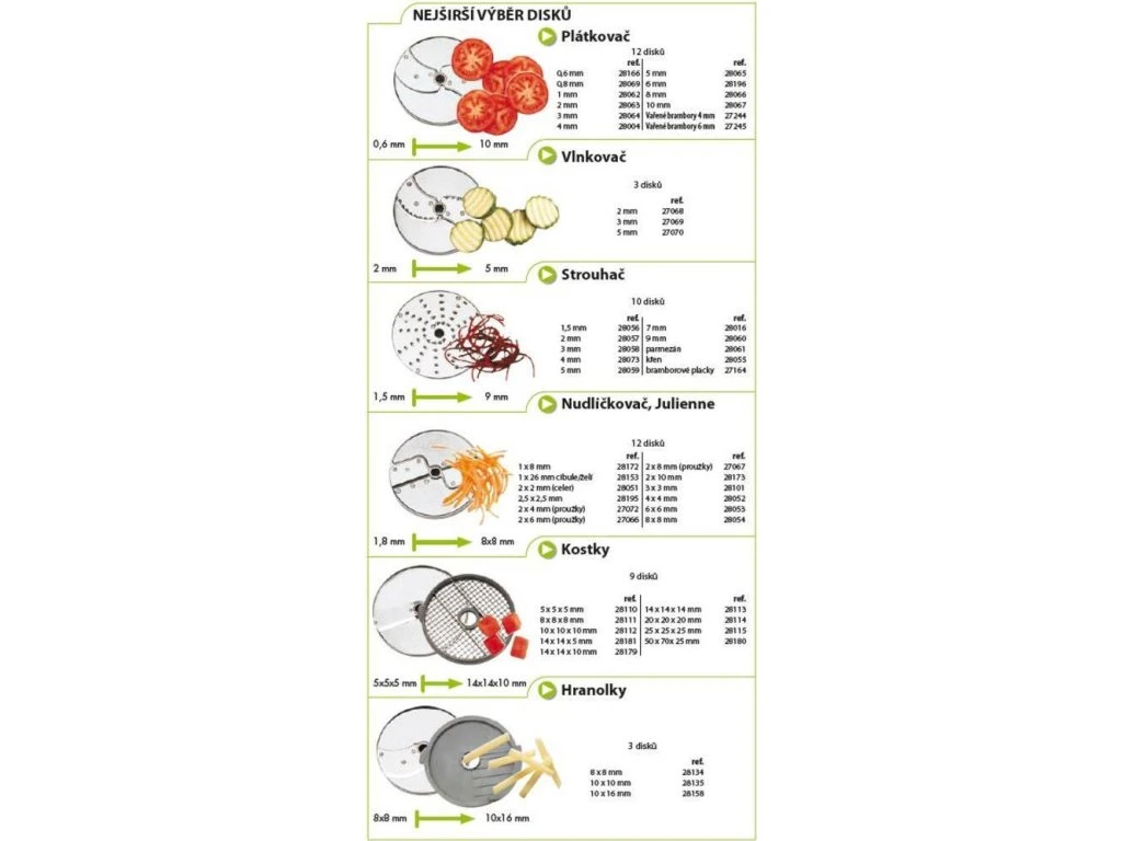 - 1985 W sada 6 disků – plátkovač 2 a 4 mm, strouhač 1,5 mm, nudličkovač 4×4 mm, kostičkovač 14×14×14 mm (2 disky – plátkovač + mřížka)