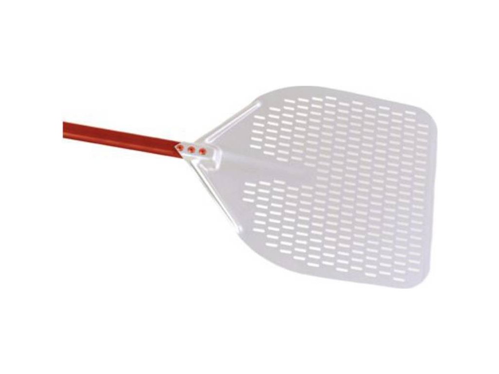 Hliníková děrovaná lopata na pizzu s lakovanou rukojetí.