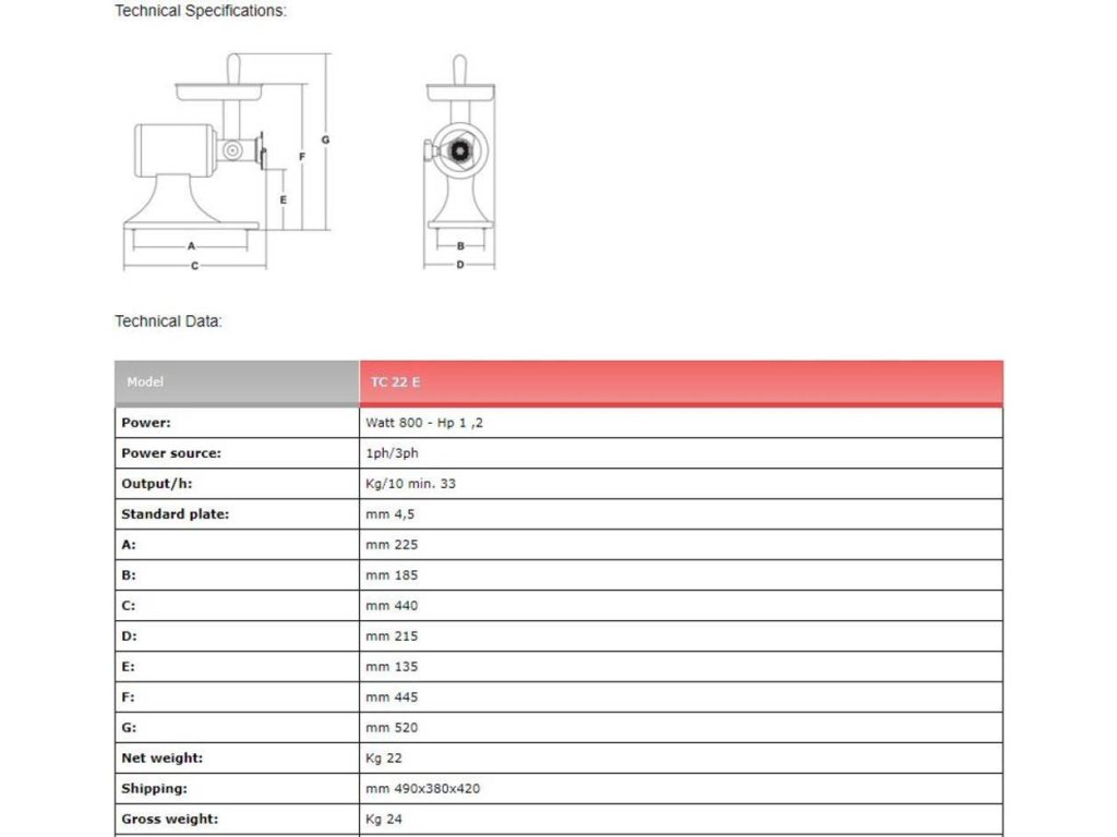 Mlýnek na maso TC 22 E, 230 V od italského výrobce SIRMAN
