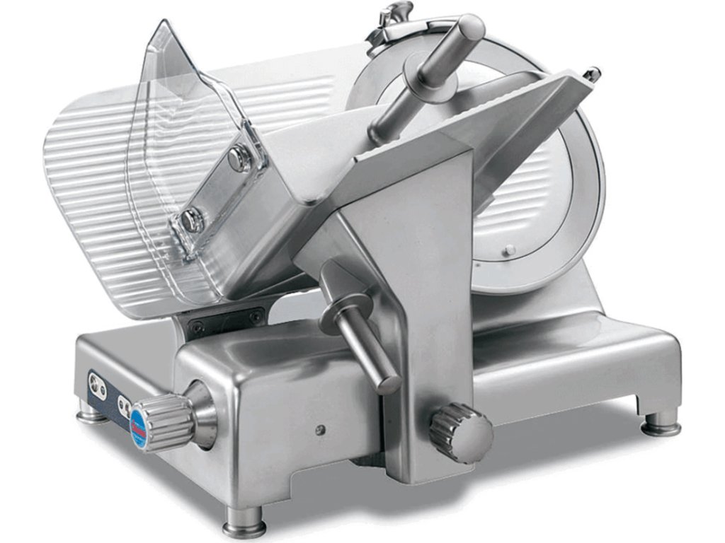 Nářezový stroj GALILEO 350 EVO INGR TOP s nožem o průměru 350 mm s uložením posuvného stolu našikmo, od italského výrobce SIRMAN.