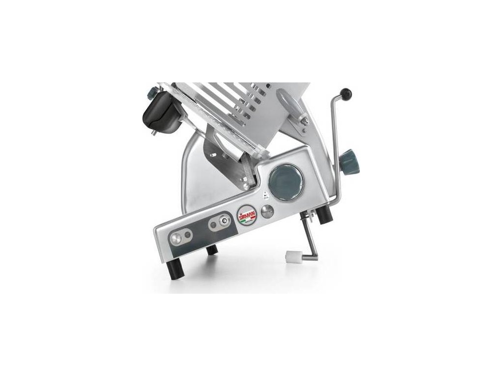 Nářezový stroj PALLADIO 350 TOP s teflonovým nožem o průměru 350 mm s uložením posuvného stolu našikmo, od italského výrobce SIRMAN.