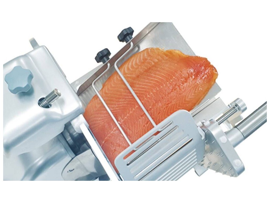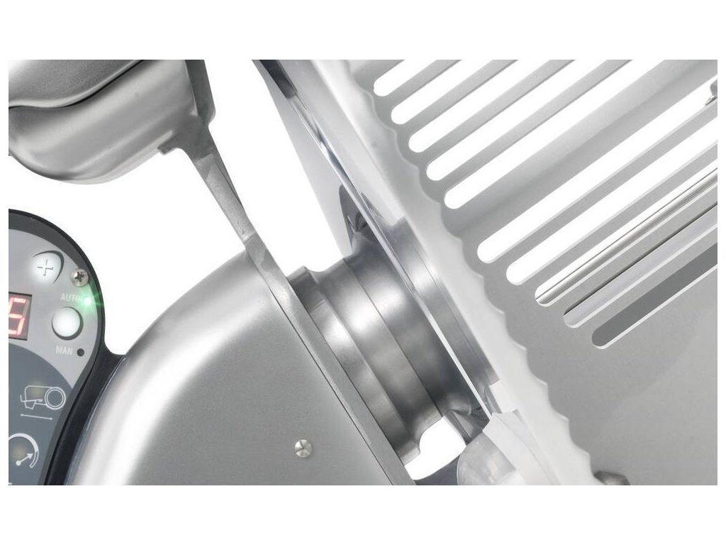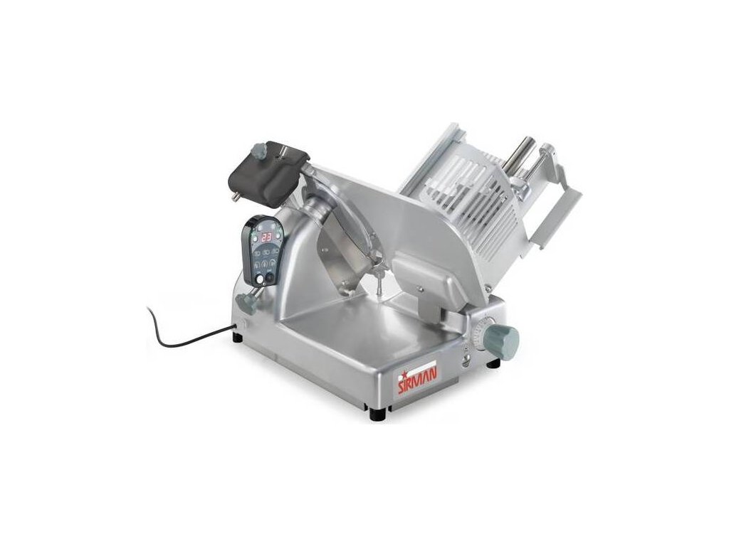 Nářezový stroj PALLADIO AUTOMATICA 300 s teflonovým nožem o průměru 300 mm s uložením posuvného stolu našikmo, od italského výrobce SIRMAN.