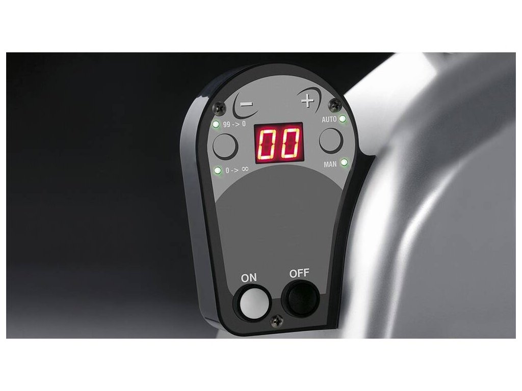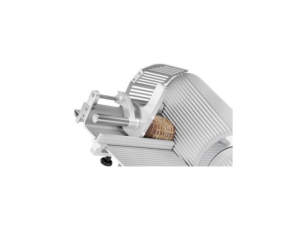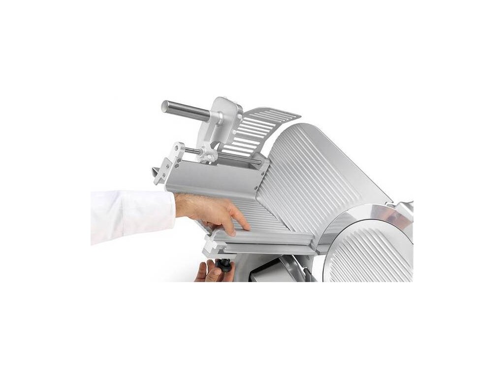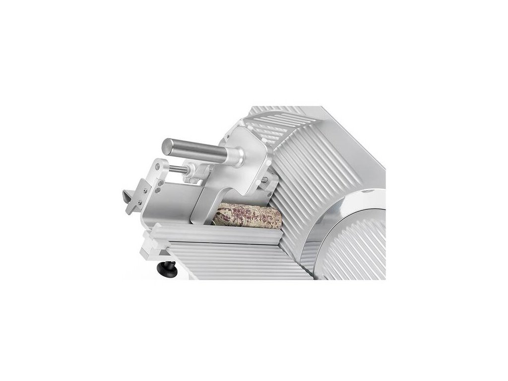 - model je vybaven automatickým pojezdem, který umožňuje automatické krájení upevněné suroviny bez nutnosti manuálního posuvu pojezdového stolu obsluhou, nářezový stroj tak automaticky krájí bez nutnosti zásahu obsluhy v průběhu krájení