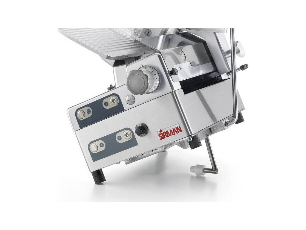 Nářezový stroj PALLADIO AUTOMEC 300 s nerezovým nožem o průměru 300 mm s uložením posuvného stolu našikmo, od itaslkého výrobce SIRMAN.