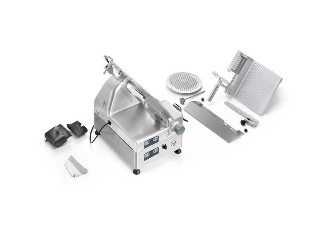 Nářezový stroj PALLADIO AUTOMEC 300 s nerezovým nožem o průměru 300 mm s uložením posuvného stolu našikmo, od itaslkého výrobce SIRMAN.
