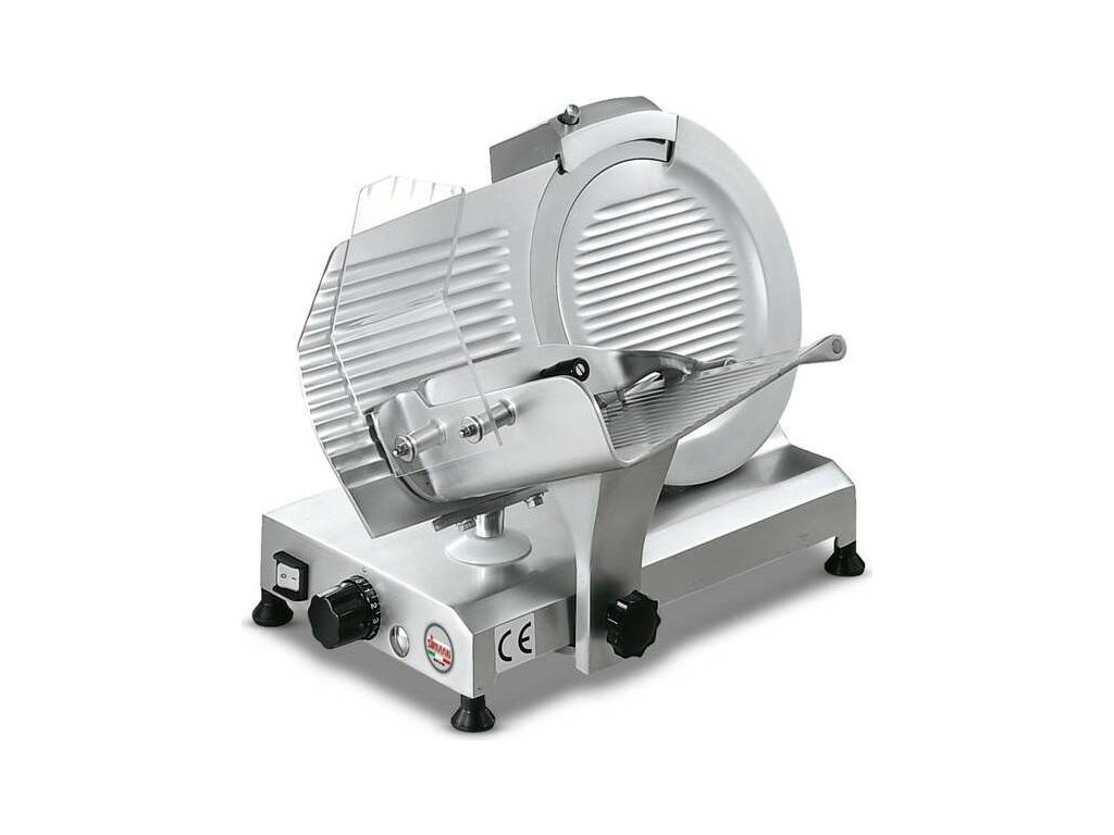 Nářezový stroj TOPAZ 250 C s nožem o průměru 250 mm s uložením posuvného stolu našikmo, od italského výrobce SIRMAN.