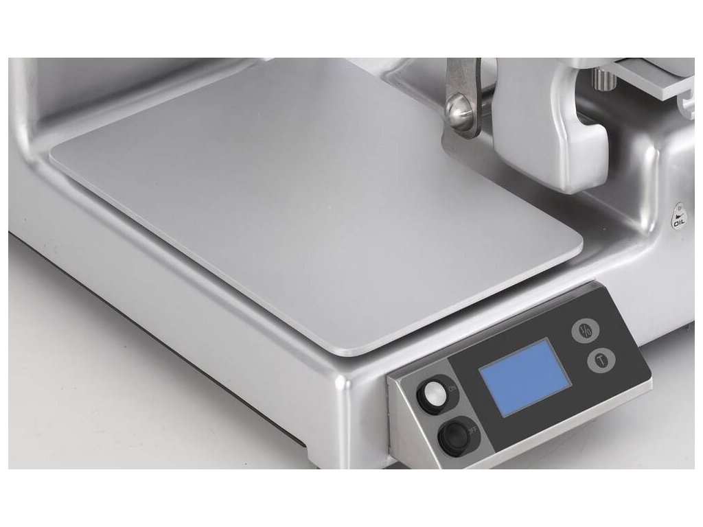 Nářezový stroj LEONARDO 350 EVO BS2 TOP s nožem o průměru 350 mm s uložením posuvného stolu rovně.