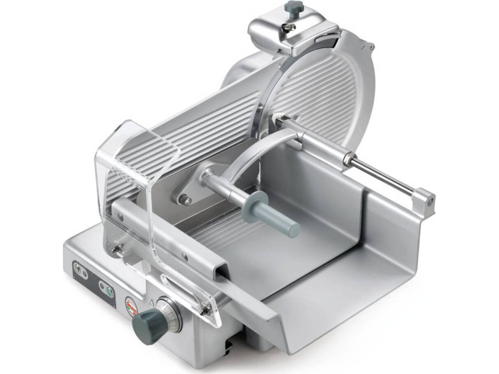 Nářezový stroj LEONARDO 350 EVO VCS s nožem o průměru 350 mm s uložením posuvného stolu rovně.