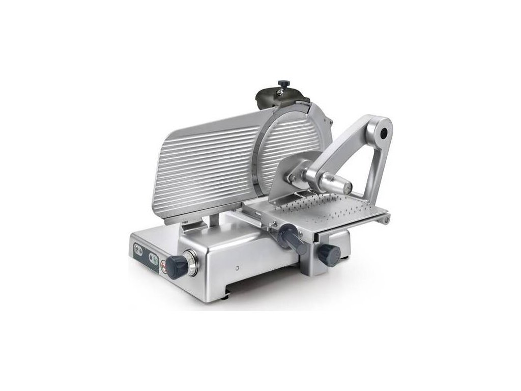 Nářezový stroj LEONARDO 370 EVO BS2 s nožem o průměru 370 mm s uložením posuvného stolu rovně.