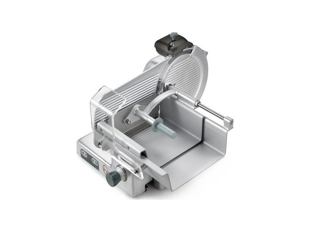 Nářezový stroj LEONARDO 385 EVO VCS s nožem o průměru 385 mm s uložením posuvného stolu rovně.