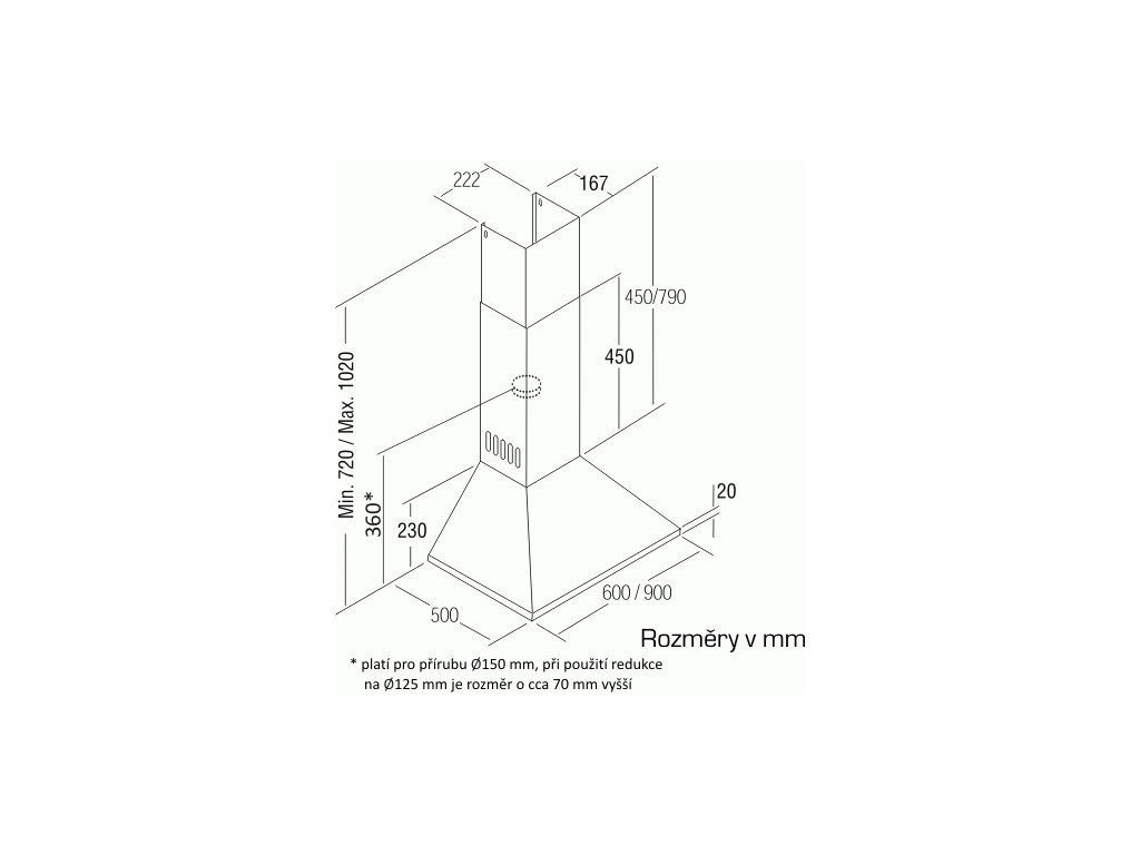 Komínová ke zdi, 600 mm, nerez, ovládání VL3 s modře prosvětlenými tlačítky, 1 motor BT2 240 W, 3 rychlosti, 645 m3/h (5 Pa) – dle UNE-EN 61591, max. hlučnost Lw 69 dB(A), max. tlak 405 Pa, 15 min. časovač, halogenová světlaDoplňkové parametry