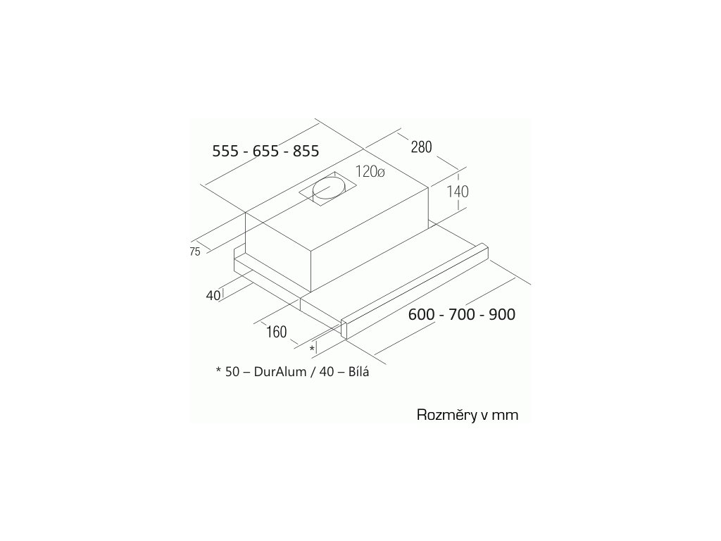 Vestavná výsuvná, 600 mm, nerez lišta s povrchem DurAlum, 1 motor 80 W, 2 rychlosti, 340 m3/h (15 Pa), max. tlak 194 Pa, max. hlučnost Lw 55 dB. Recirkulační režim u vestavných digestoří: Digestoř se osadí uhlíkovým pachovým filtrem. Přefiltrovaný vzduch se z digestoře odvádí obdobně jako u odtahového režimu trubkou, která prochází celou skříňkou. Tato trubka však neústí kolenem do zdi, ale nad skříňku, kde ji doporučujeme zakončit mřížkou.Pro výrobu skříňky je směrodatný rozměrový nákres a údaje v něm uvedené. Fotografie digestoří jsou ilustrační.Doplňkové parametry