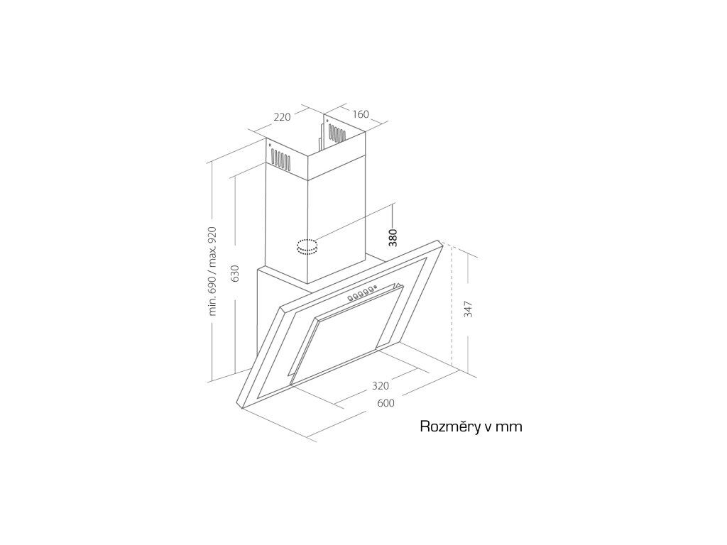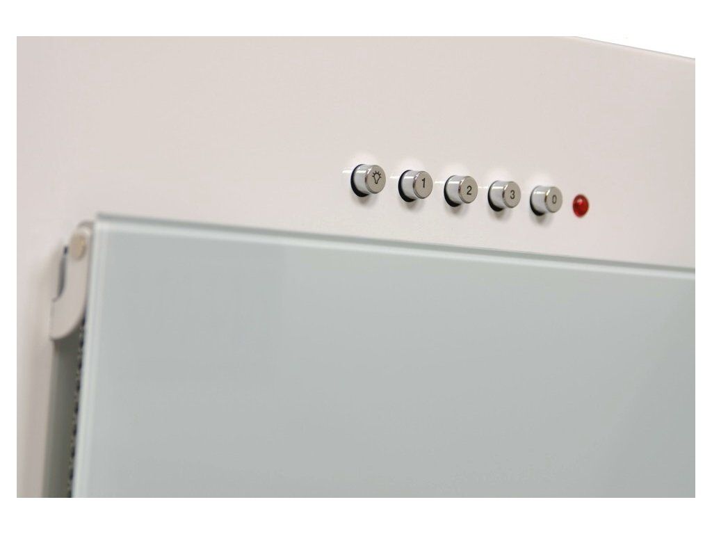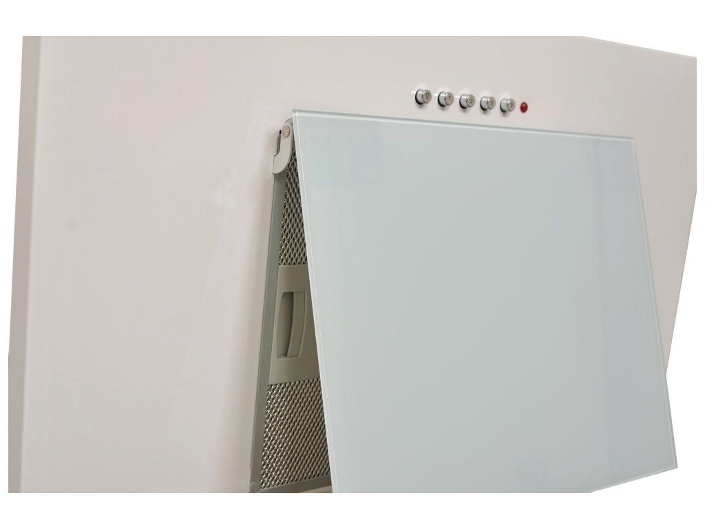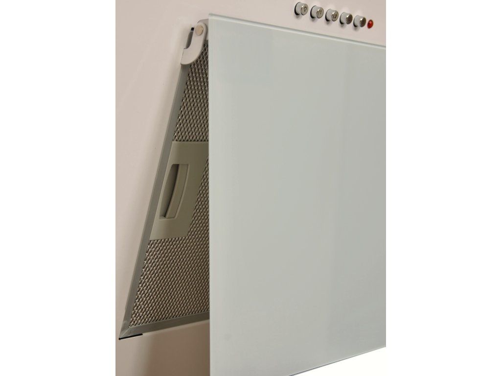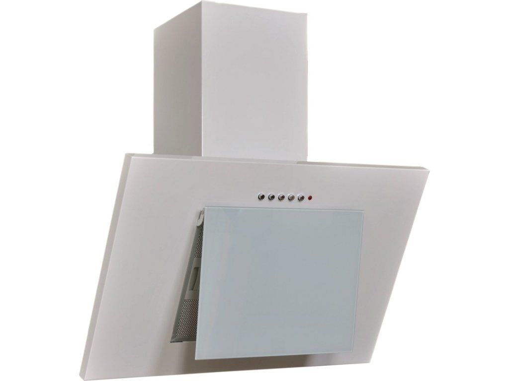 Komínová digestoř ke zdi, šíře 60 cm, bílá / bílé sklo, max. výkon 326 m3/h (15 Pa), hlučnost Lw 56 – 70 dB(A), 3 rychlosti, odsávací jednotky mají individuálně vyvažovanou turbínu, motory jsou opatřené vratnými tepelnými pojistkami (při přetížení motoru vypne, po jeho vychladnutí opět sepne), mechanické tlačítkové ovládání, kovové sendvičové tukové filtry, které lze mýt v myčce, možnost práce v odtahovém i recirkulačním režimu, výstupní průměr 120 mm, Výbava: úsporné LED osvětlení 2 × 2 W, Benefity: šikmá digestoř zvětšuje manipulační prostor nad varnou deskou a výrazně omezuje riziko bouchnutí se do hlavy o digestoř, šikmá digestoř může být instalovaná o 10-15 cm níž, než digestoře s rovnou spodní částí (snazší dostupnost ovládacích prvku i pro osoby menšího vzrůstu)