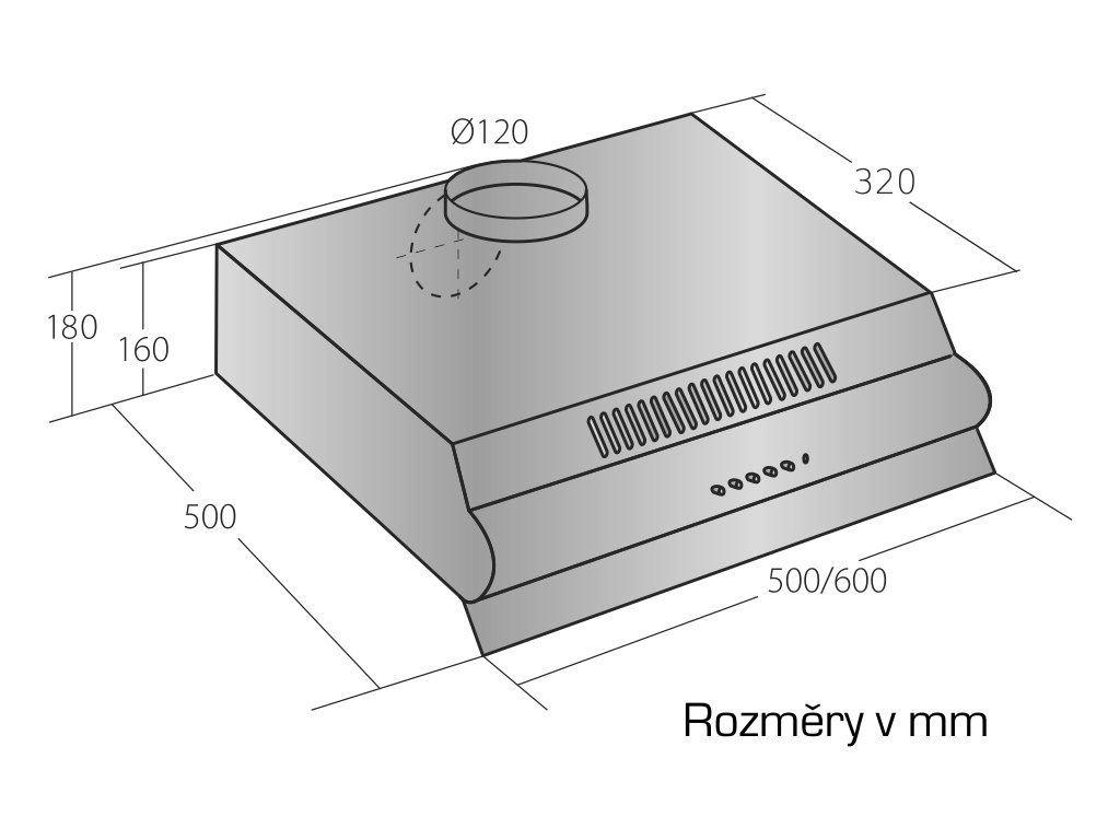 Podskříňková digestoř, šíře 50 cm,nerez, max. výkon 160 m3/h (15 Pa), hlučnost Lw 50 – 61 dB(A), 3 rychlosti, mechanické tlačítkové ovládání, kovové sendvičové tukové filtry, které lze mýt v myčce, možnost práce v odtahovém i recirkulačním režimu, výstupní průměr 120 mm, osvětlení 1 × 4 W LED žárovka E14, Výbava: zdarma zpětná klapka