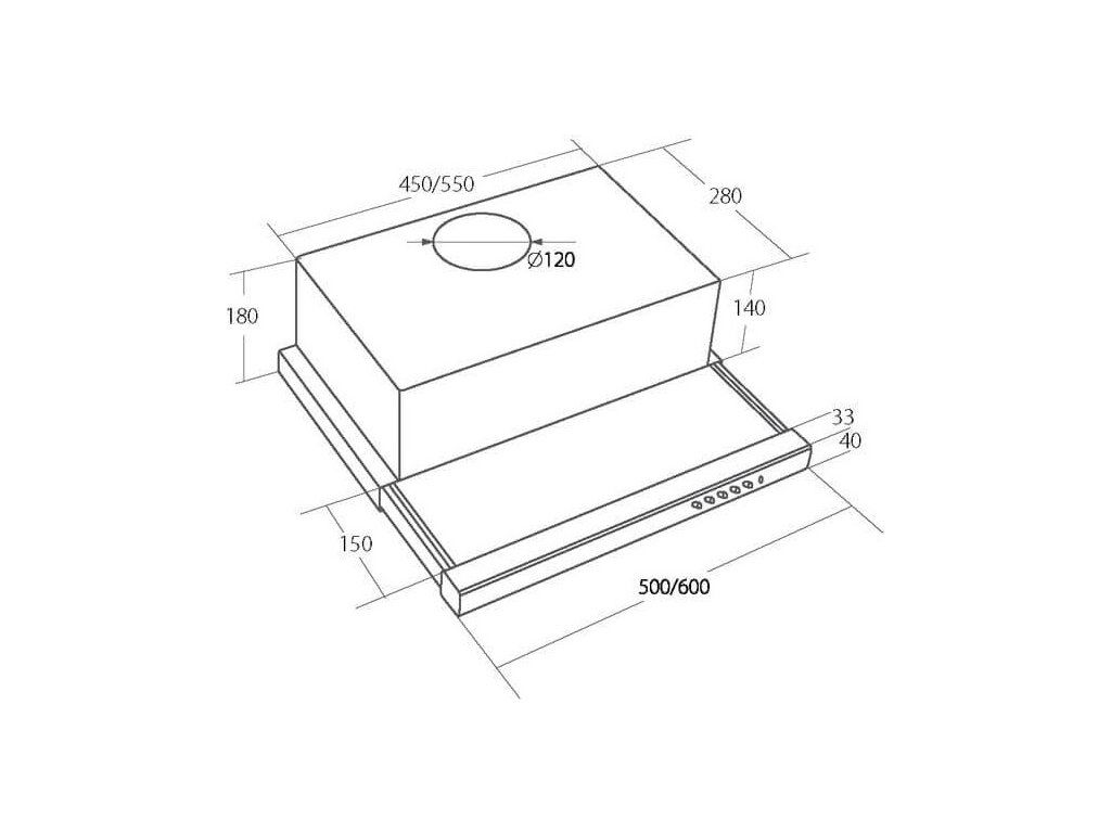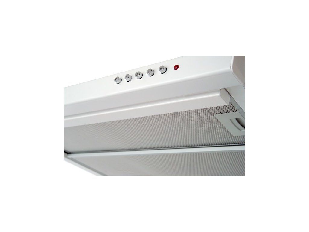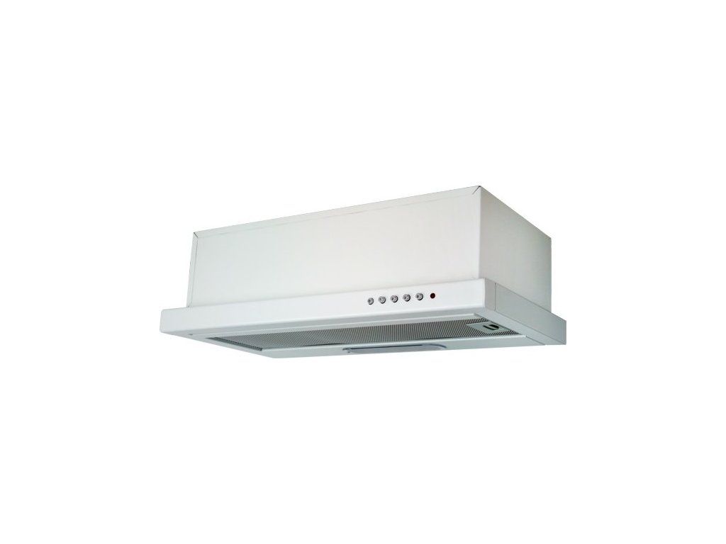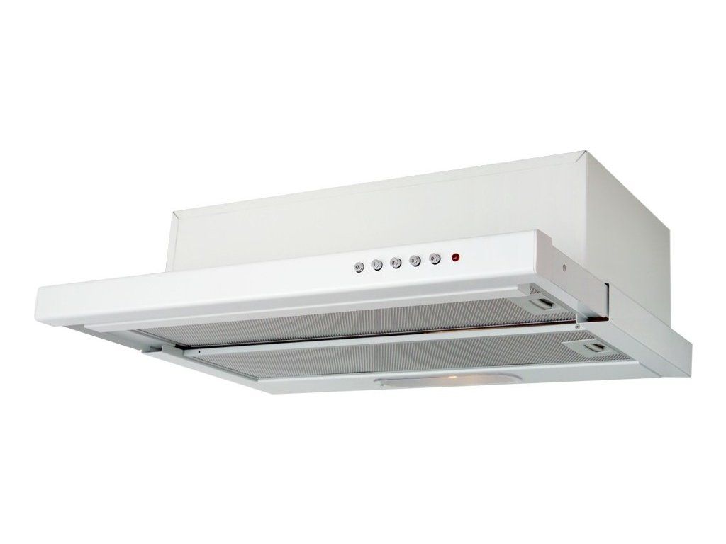 Vestavná digestoř výsuvná, šíře 50 cm, bílá, max. výkon 338 m3/h (15 Pa), hlučnost Lw 56 – 71 dB(A), 3 rychlosti, odsávací jednotky mají individuálně vyvažovanou turbínu, motory jsou opatřené vratnými tepelnými pojistkami (při přetížení motoru vypne, po jeho vychladnutí opět sepne), mechanické posuvné ovládání, kovové sendvičové tukové filtry, které lze mýt v myčce, možnost práce v odtahovém i recirkulačním režimu, Výbava: úsporné LED osvětlení 2 × 2 W, zdarma zpětná klapka Recirkulační režim u vestavných digestoří: Digestoř se osadí uhlíkovým pachovým filtrem. Přefiltrovaný vzduch se z digestoře odvádí obdobně jako u odtahového režimu trubkou, která prochází celou skříňkou. Tato trubka však neústí kolenem do zdi, ale nad skříňku, kde ji doporučujeme zakončit mřížkou. Pro výrobu skříňky je směrodatný rozměrový nákres a údaje v něm uvedené. Fotografie digestoří jsou ilustrační.