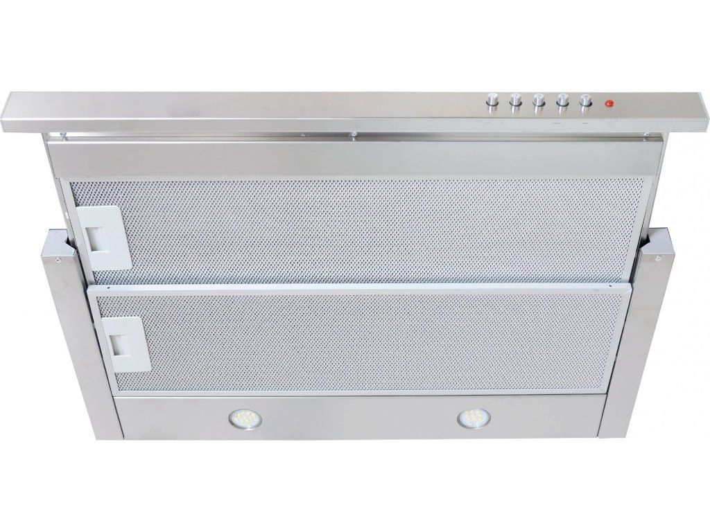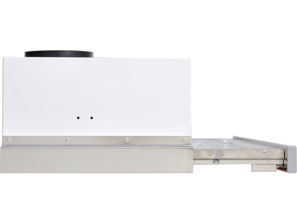 Vestavná digestoř výsuvná, šíře 50 cm, bílá s nerez lištou, max. výkon 338 m3/h (15 Pa), hlučnost Lw 56 – 71 dB(A), 3 rychlosti, odsávací jednotky mají individuálně vyvažovanou turbínu, motory jsou opatřené vratnými tepelnými pojistkami (při přetížení motoru vypne, po jeho vychladnutí opět sepne), mechanické posuvné ovládání, kovové sendvičové tukové filtry, které lze mýt v myčce, možnost práce v odtahovém i recirkulačním režimu, Výbava: úsporné LED osvětlení 2 × 2 W, zdarma zpětná klapka Recirkulační režim u vestavných digestoří: Digestoř se osadí uhlíkovým pachovým filtrem. Přefiltrovaný vzduch se z digestoře odvádí obdobně jako u odtahového režimu trubkou, která prochází celou skříňkou. Tato trubka však neústí kolenem do zdi, ale nad skříňku, kde ji doporučujeme zakončit mřížkou. Pro výrobu skříňky je směrodatný rozměrový nákres a údaje v něm uvedené. Fotografie digestoří jsou ilustrační.