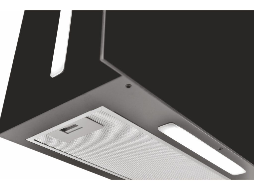 Komínová digestoř ke zdi, šíře 80 cm, černá / černé sklo, max. výkon 382 m3/h (5 Pa), hlučnost Lw 59 – 69 dB(A), 3 rychlosti, odsávací jednotky mají individuálně vyvažovanou turbínu, motory jsou opatřené vratnými tepelnými pojistkami (při přetížení motoru vypne, po jeho vychladnutí opět sepne), kovové sendvičové tukové filtry, které lze mýt v myčce, výstupní průměr 150 mm, možnost práce v odtahovém i recirkulačním režimu, VIP výbava: úsporné LED osvětlení 3 × 2,8 W, elektronické dotykové ovládání s doběhovým časovačem, zdarma dálkový ovladač i s bateriemi, zdarma redukce na 120 mm a zpětná klapka, Benefity: používání dálkového ovládání usnadňuje údržbu digestoře (méně otisků na digestoři = snazší čištění), ovladač je opatřený magnetem, lze jej přichytit třeba na dveře lednice (může být snadno po ruce, nikam nezapadne), šikmá digestoř zvětšuje manipulační prostor nad varnou deskou a výrazně omezuje riziko bouchnutí se do hlavy o digestoř, šikmá digestoř může být instalovaná o 10-15 cm níž, než digestoře s rovnou spodní částí (snazší dostupnost ovládacích prvku i pro osoby menšího vzrůstu)