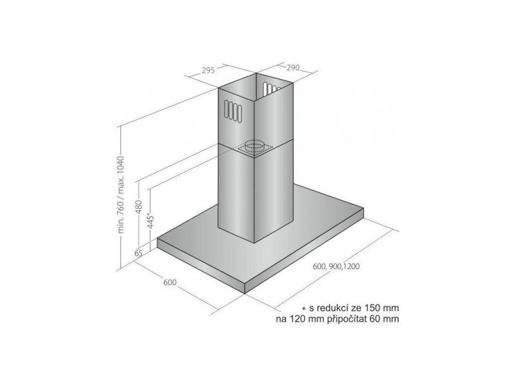 Ostrůvková digestoř, šíře 60 cm, nerez, max. výkon 763 m3/h (5 Pa), hlučnost Lw 50 – 71 dB(A), 3 rychlosti + TURBO, odsávací jednotky mají individuálně vyvažovanou turbínu, motory jsou opatřené vratnými tepelnými pojistkami (při přetížení motoru vypne, po jeho vychladnutí opět sepne), kovové sendvičové tukové filtry, které lze mýt v myčce, výstupní průměr 150 mm, možnost práce v odtahovém i recirkulačním režimu, VIP výbava: úsporné LED osvětlení 4 × 2 W, elektronické dotykové ovládání s doběhovým časovačem, zdarma dálkový ovladač i s bateriemi, zdarma redukce na 120 mm a zpětná klapka, Benefity: používání dálkového ovládání usnadňuje údržbu digestoře (méně otisků na digestoři = snazší čištění), ovladač je opatřený magnetem, lze jej přichytit třeba na dveře lednice (může být snadno po ruce, nikam nezapadne)