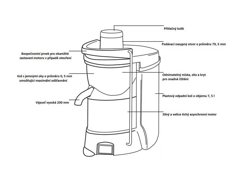 - koš filtrační s jemnými oky o průměru 0,5 mm – hloubka a jemnost síta umožňuje maximální odstředění