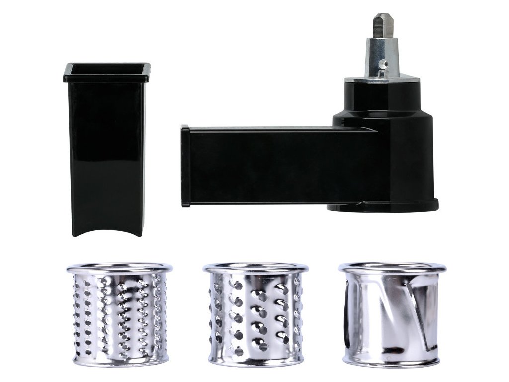 Příslušenství k MM-902. - Posuvník. - Strouhací komora. - Jemný strouhací válec (3 mm). - Hrubý strouhací válec (7 mm). - Plátkovací nože.