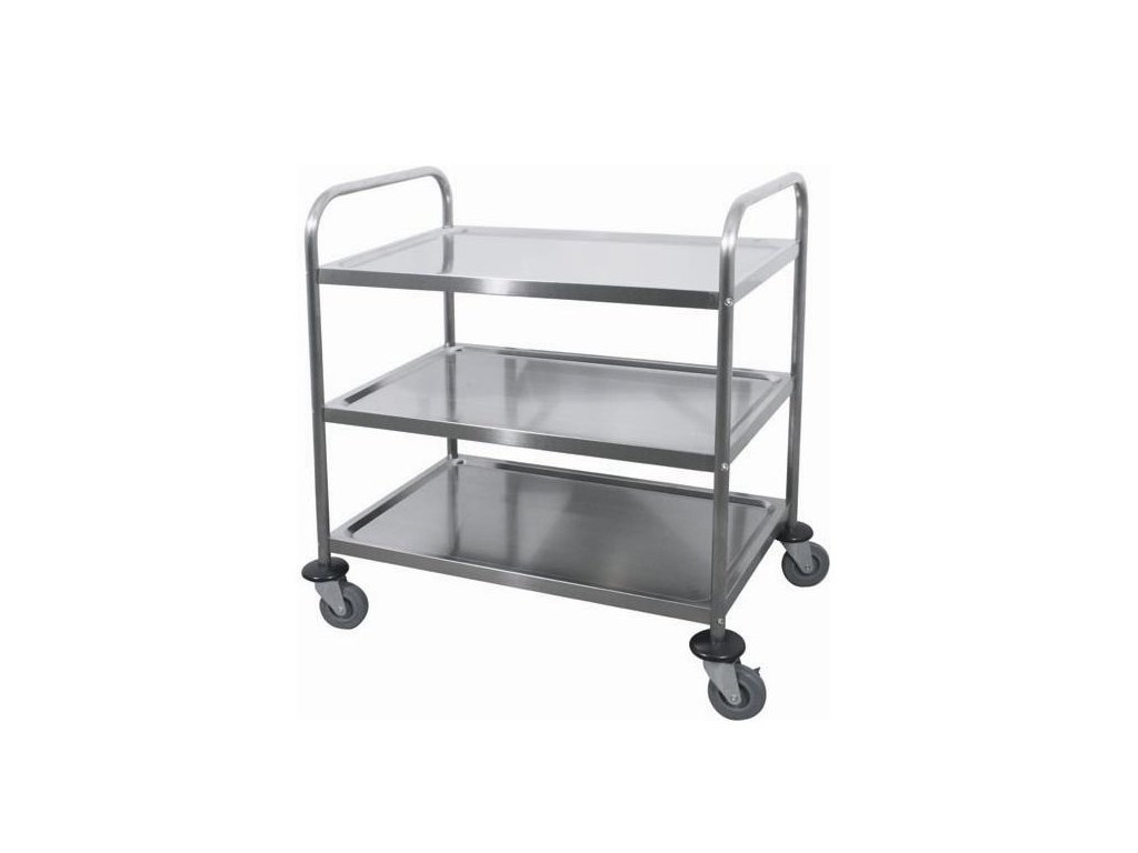 Uklidový/servírovací vozík je vyroben z ušlechtilé oceli. Čtyři kolečka, 2 bržděná. Max. nosnost 120 kg. Provední s dvěma či třemi patry.Parametry: provedení: 3 patra,rozměry cm: 85 x 53,5 x 94 cm,rozměry police cm: 83 x 51 cmDoplňkové parametry