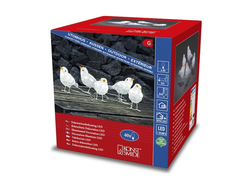 5 svítících ptáčků se 40 LED, vzdálenost mezi figurkami 1 m, délka přívodního kabelu 5m.