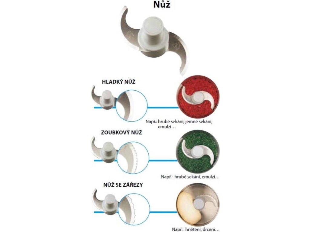 - lze v ní sekat maso, zeleninu, mandle, oříšky, koření, připravovat majonézu, pyré, protlaky, pomazánky, strouhanku a hnětat těsto