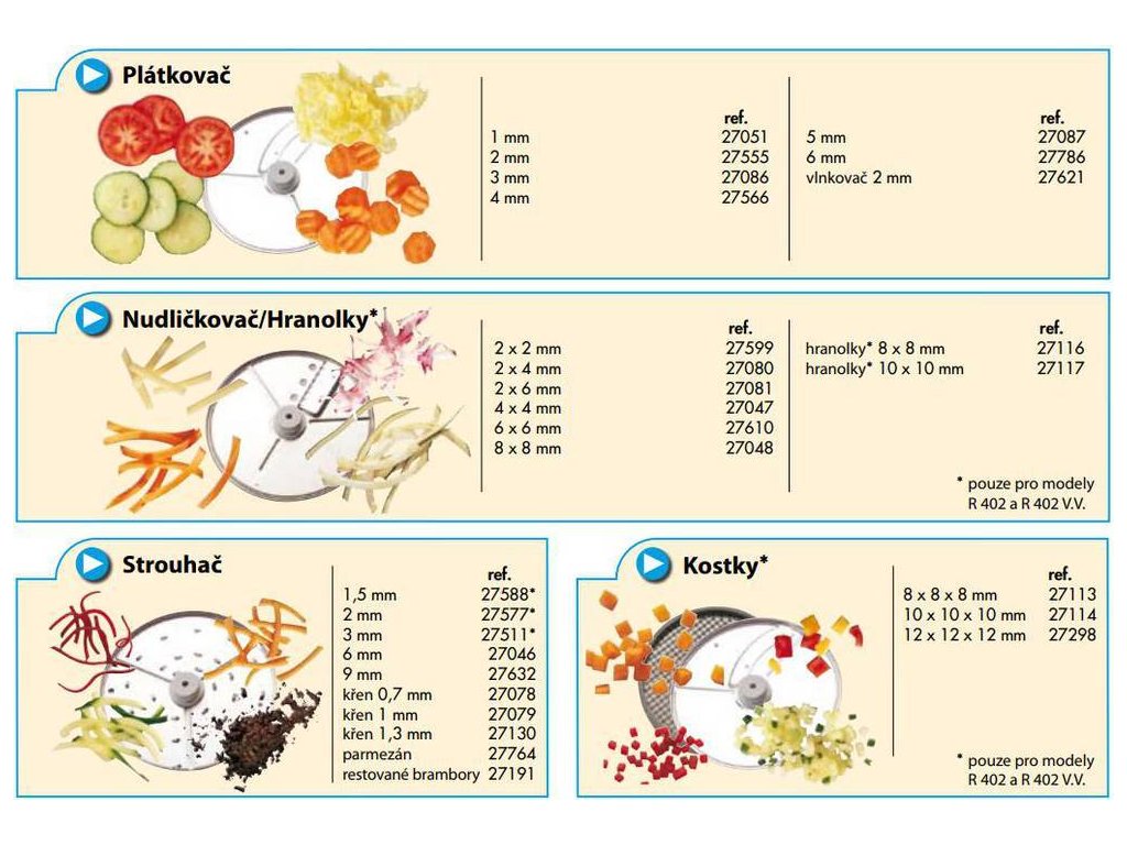 - 2014W sada 6 disků – plátkovač 2 a 4 mm, strouhač 1,5 mm, nudličkovač 4×4 mm, kostičkovač 10×10×10 mm (2 disky – plátkovač + mřížka)