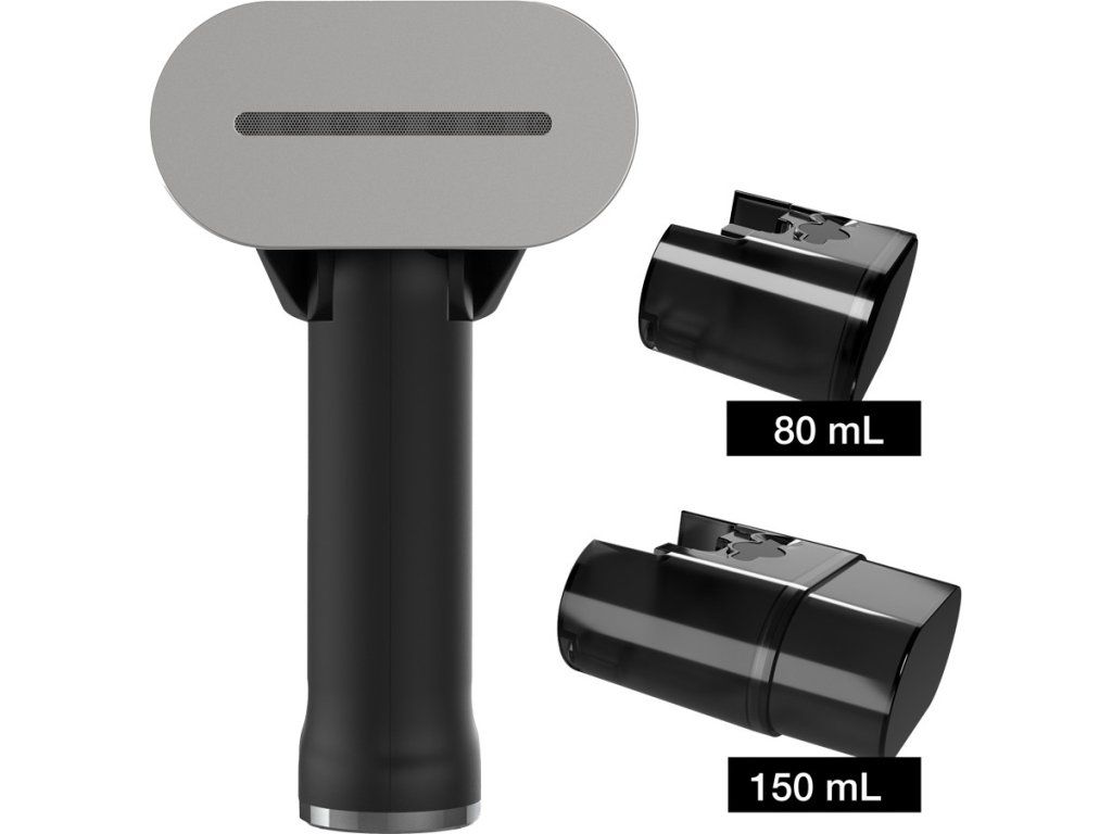 Napařovač oděvů SteamOne EUFD80B je vybaven speciálním háčkem pro snadné zavěšení oděvu i s ramínkem na dveře či skříň a dvěma vyměnitelnými nádržkami na vodu o objemu 80 ml a 150 ml.