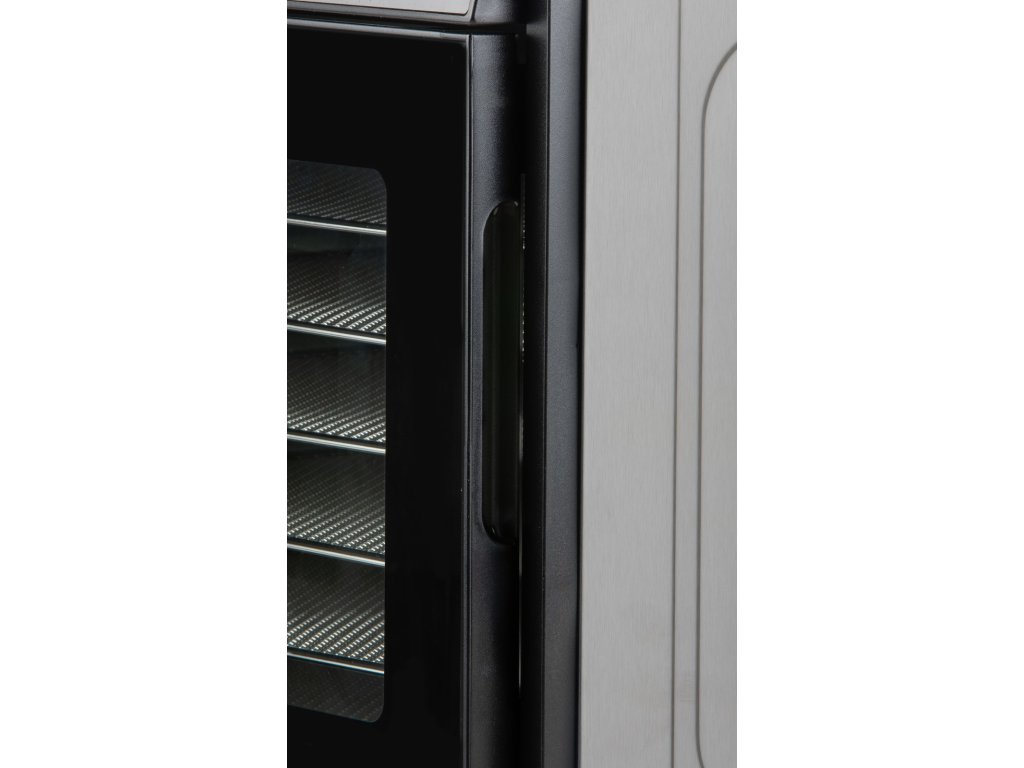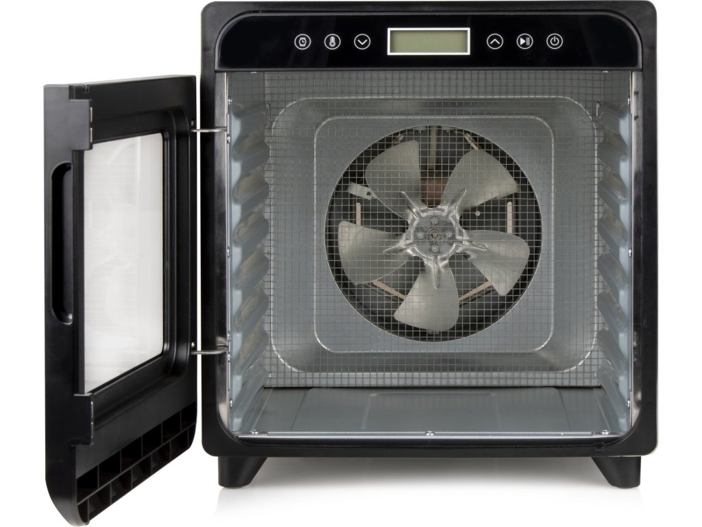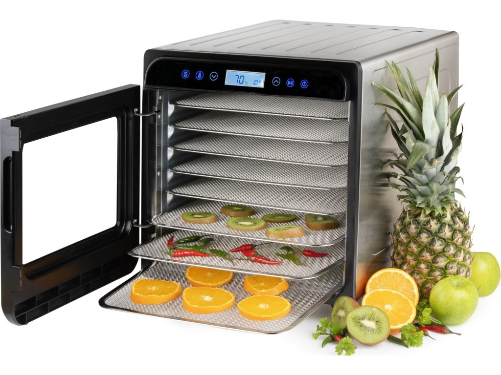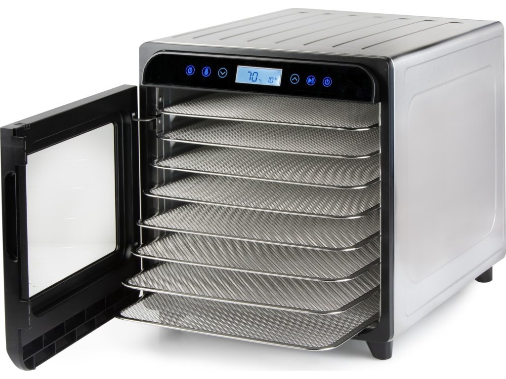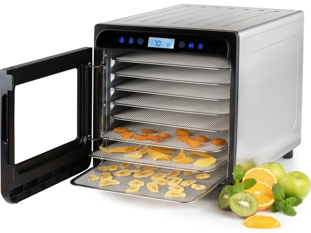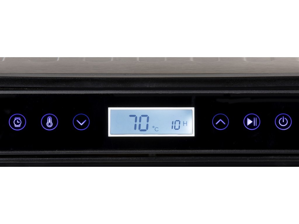 Výkonná a robustní sušička ovoce s tělem z vysoce kvalitního broušeného nerezu vybavená ventilátorem o velkém průměru, přesným digitálním ovládáním teploty a digitálním časovačem.