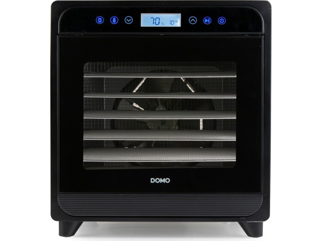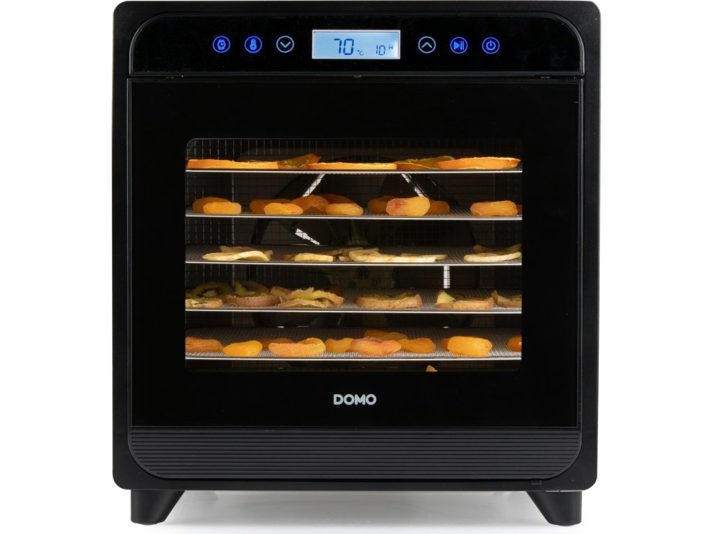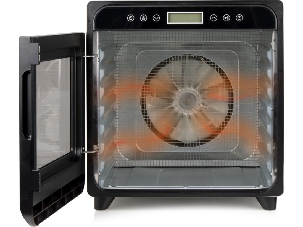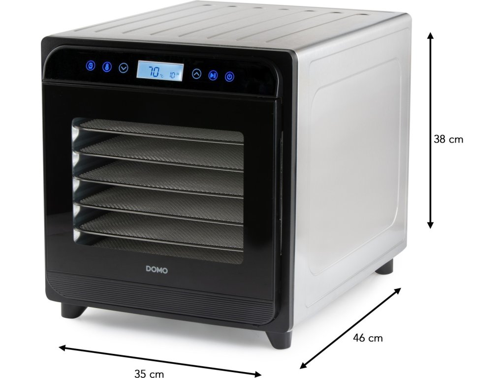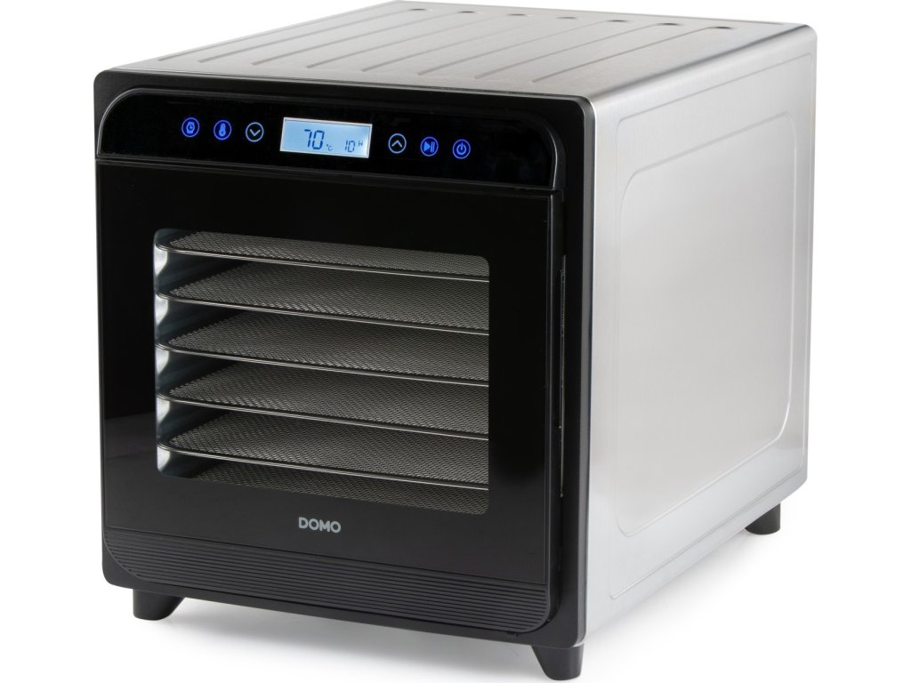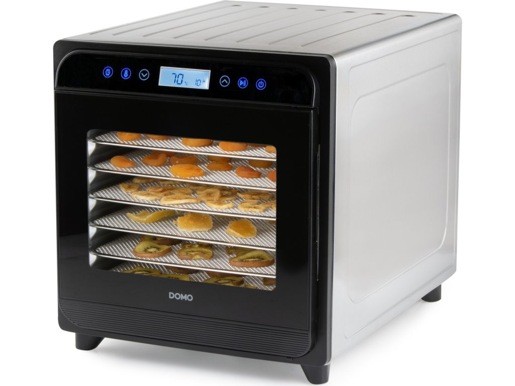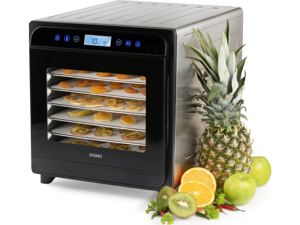 Výkonná a robustní sušička ovoce s tělem z vysoce kvalitního broušeného nerezu vybavená ventilátorem o velkém průměru, přesným digitálním ovládáním teploty a digitálním časovačem.