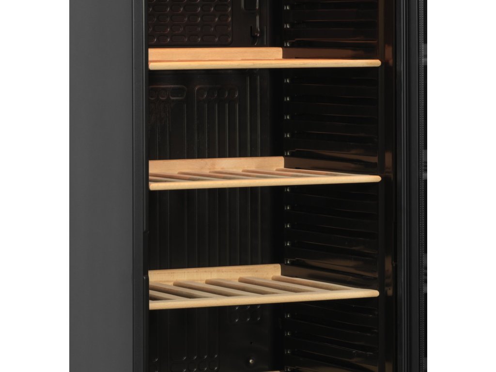 Řada chladniček na víno CPV představuje skvělý a zároveň hospodárný způsob skladování a vystavování vína. Má černý interiér i exteriér a je vybavena 6 nastavitelnými dřevěnými policemi na víno. Nabízí automatické odmrazování a systém chlazení s ventilátorem, který se snadno ovládá pomocí elektronického termostatu. Lze měnit otevírání dveří, je nutné dokoupit levý pant.prosklené křídlové dveře|1 teplotní zóna|LED osvětlení|nastavitelné police|tónované prosklené dveře pro ochranu vína|lze měnit otevírání dveří|černý interiér a exteriér|zámek|police pro prezentaci zboží jako příslušenství