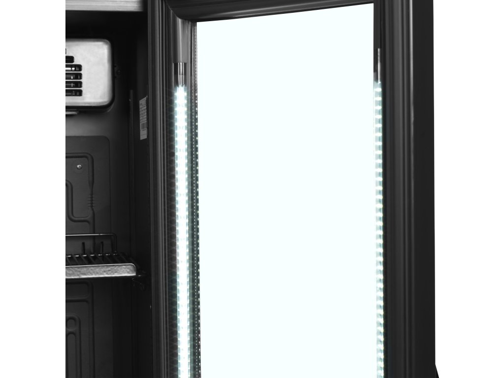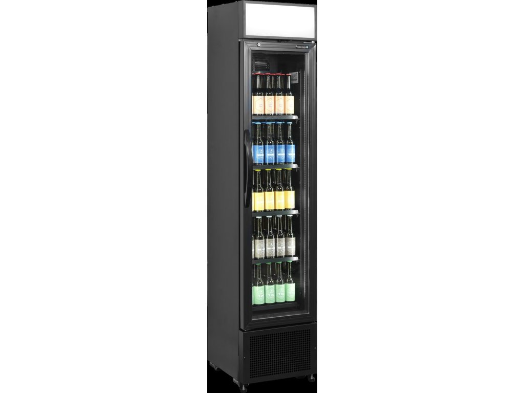 Řada FSC Slim nabízí vynikající kvalitu provedení za příznivou cenu. Úzký model má prosklené dveře a je k dispozici v bílé nebo černé barvě. Získáte možnost skvělé prezentace produktů v kombinaci s výkonným chladicím systémem a nastavitelnými policemi umožňujícími flexibilitu. Chladicí vitrína je ideální pro prezentaci značky a díky osvětlenému reklamnímu panelu v horní části jistě upoutá pozornost zákazníků.černý interiér a exteriér|reklamní panel s LED osvětlením|samozavírací prosklené dveře na pantech|LED osvětlení v rámu dveří|nastavitelné police|chlazení s pomocným ventilátorem|vnitřní základna z nerezové oceli|digitální ukazatel teploty|plně automatický provoz