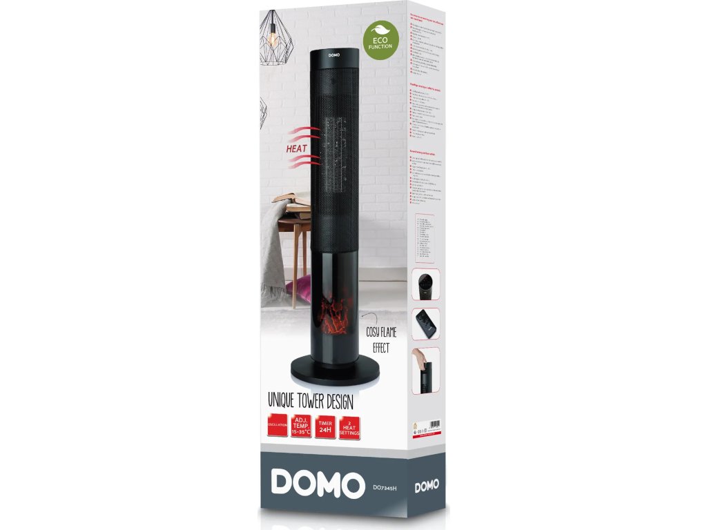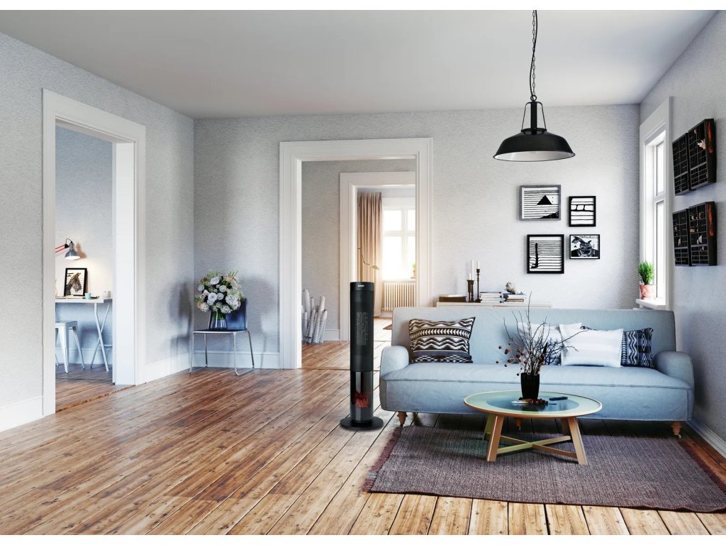 Sloupové topení s keramickým topným tělesem a působivou imitací hořícího ohně ozvláštní každou místnost. Rychlý tepelný účinek zajišťují dva ventilátory a automatická oscilace, tedy otáčení do stran. Pro ještě větší pohodlí můžete přístroj ovládat i na dálku přiloženým dálkovým ovladačem. Topení je vybaveno speciálním ECO režimem, ve kterém si topení automaticky udržuje teplotu mezi 18 až 22 °C a podle potřeby si samo mění tepelný výkon.