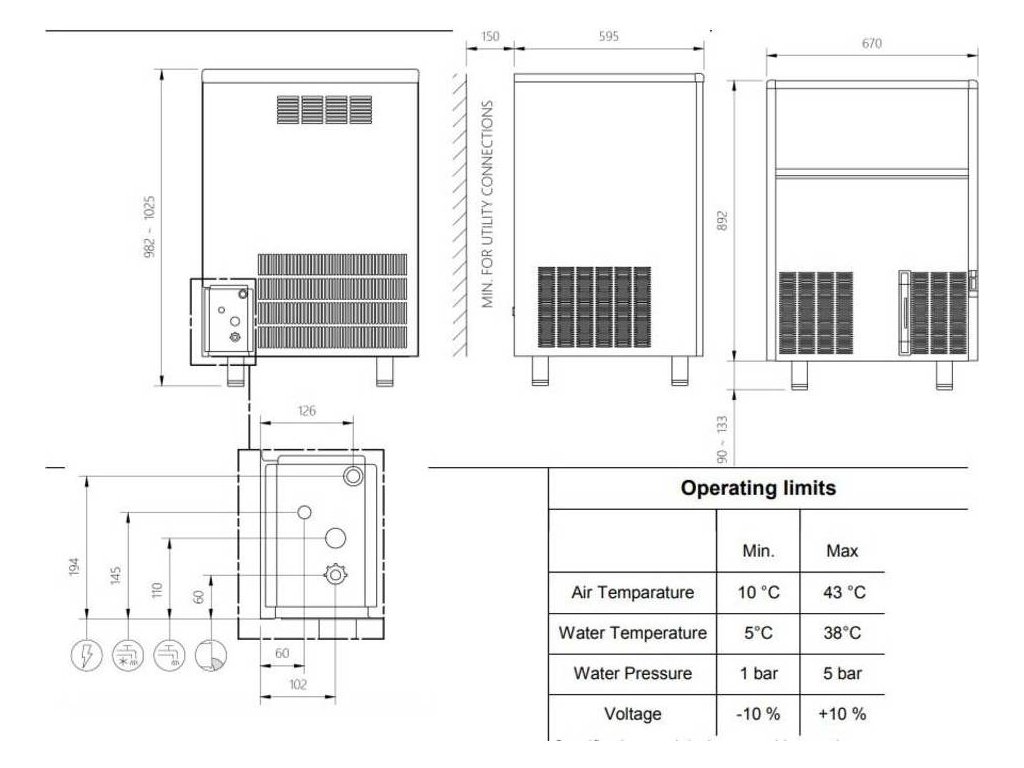- produkce ledu 92 kg/24 hodin (denní produkce při teplotě okolí 10° C a teplotě přívodní vody 10° C)